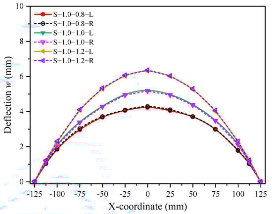 The transverse deformation profiles, which were measured in situ by using the 3D-scanning instrument, along the X-axis for each deformed plate are presented in Figure 9a. It was found that the final deformed profiles of each plate were all approximately in cosine forms, and the maximum deflections occurred at the central point. Furthermore, the fitted curve using the cosine function for the final deformed profile of “S-1.0-1200” is also given in Figure 9a, with a small error from the test result. The final deflections at the steel plate center with respect to the drop height are plotted in Figure 9b, which shows that the final central deflection increased almost linearly with the drop height. In addition, in order to analyze the effect of the measurement of slamming pressure on the plastic response of the flat plate, the comparison of the deformation profiles of two equal plates installed on the left and right sides at different drop heights is shown in Figure 10. It is noted that “L” and “R” in the figure represent the strain-measuring plate on the left side and the pressure-measuring plate on the right side, respectively. As shown in the figure, the final deformations of the square plates on the left and right sides were in good agreement under various drop heights, which indicates that the pressure sensors had little effect on the plastic response of the flat plate under the given test conditions.