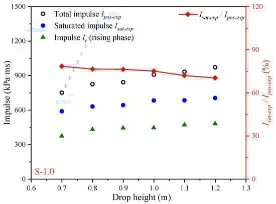 Figure 12 shows the relationship of the saturated impulse Isat-exp and the total impulse to the drop height, in which the ratio of the saturated impulse Isat-exp to the total impulse Ipos-exp (defined as the first positive impulse) is also plotted. It is seen that both the total impulse and saturated impulse increased almost linearly with the drop height, while the ratio gradually decreased, which indicates that the saturation phenomenon of the steel plate was more likely to being achieved. In addition, since the saturated impulse Isat-exp was larger than the impulse Ir of the rising section for different test conditions, the saturation phenomenon always took place during the decaying section of the slamming pulse loading.