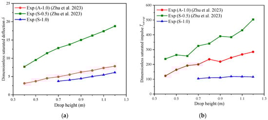 Figure 13a illustrates the relationship between the dimensionless saturated deflection and the drop heights for the three types of test plates (A-1.0, S-0.5, and S-1.0), where δ = w/h, w is the final deflection at the plate center, and h is the plate thickness. As shown in the figure, the dimensionless saturated deflections of the 0.5 mm steel plates were the largest, followed by those of the 1.0 mm aluminum plate, while the saturated deflections of the 1.0 mm steel plates were the smallest. Furthermore, Figure 13b depicts the dimensionless saturated impulses with the drop heights for various test plates, and the dimensionless saturated impulse can be expressed as