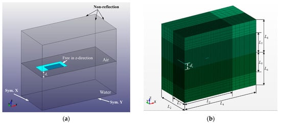 In previous studies, it was demonstrated that the application of a symmetric model can greatly reduce the computation time without compromising the precision of the numerical results. A quarter model with symmetric boundaries on the XOZ and YOZ planes, as presented in Figure 14a, was therefore used for the FSI analysis based on the symmetry conditions. In the structural model, the steel boundary-supporting fixture was set to allow free motion in the z-direction only. It is noted that extra mass should be assigned to the boundary-supporting plates to achieve the actual one-quarter of the total weight measured in the test. In addition, the dimensions of the fluid domains were set to approximately three times the length and width of the structural model, which was consistent with the required specifications [32]. Since the overall size of the water tank in the test ensured no wave reflection at the boundary during the slamming process, all boundary surfaces of the fluid domains in the numerical model, except for the symmetry planes, were defined as non-deflection conditions to prevent boundary effects. Due to the large size of the fluid domain, mesh refinement for all fluid domains was not suitable in terms of computational time. Therefore, mesh refinement was performed on the local fluid domains, as shown in Figure 14b, and the detailed dimensions of the different fluid domains are given in Table 2. The mesh size of the structure and the locally refined fluid domains were set to be the same, as suggested by ref. [19]. A convergence study was conducted to analyze the sensitivity of the numerical simulations to the mesh size, as included in Appendix A. The penalty coupling mechanism between the fluids and structure was governed by the keyword *Constrained_Lagrange_In_Solid. The penalty factor, which is associated with the computed coupling force, was set to a default value of 0.1 based on previous studies [22,33].