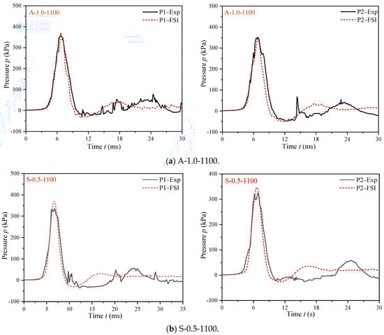 Comparison of the numerical predictions with the test results for pressure–time histories of the (a) aluminum and (b) steel plates with a drop height of 1100 mm. Exp and FSI refer to the experiments and numerical simulations that considered the fluid–structure interaction, respectively.