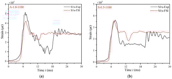 Comparison of numerical predictions with test results for the strain–time histories of the (a) aluminum and (b) steel plates (A-1.0-1100 and S-0.5-1100).