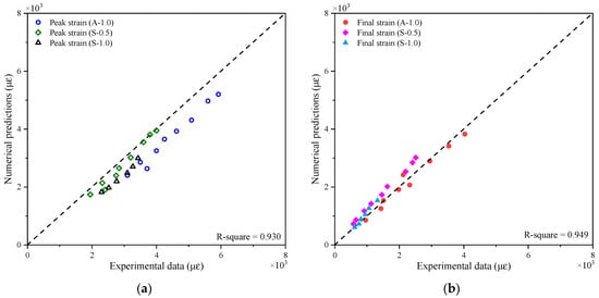 Graphs of numerical predictions of (a) peak strain and (b) final strain versus experimental results.