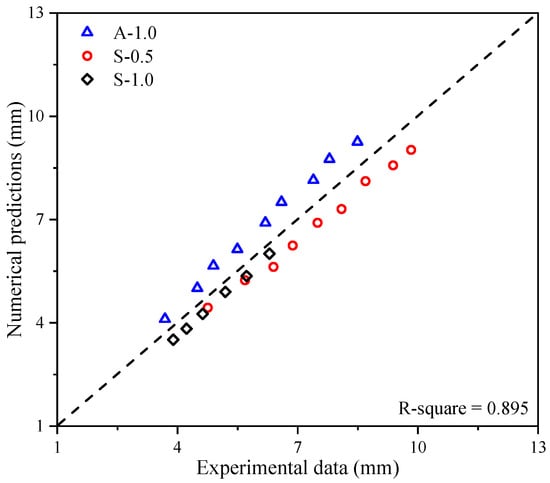 Figure 20 plots the numerical predictions of the final central deflection of various flat plates against the experimental data. In general, reasonable agreements were achieved, with average errors of 12.1%, 8.8%, and 7.2% for the aluminum plates (A-1.0), steel plates of thickness 0.5 mm (S-0.5), and steel plates of thickness 1.0 mm (S-1.0), respectively. It was observed, however, that the numerical predictions for the aluminum plates were all larger than the test results, while the numerical predictions for the steel plates were all smaller than the test data, and this difference in the final deflections of the aluminum and steel plates may be improved if accurate boundary conditions and strain rate parameters are taken into account in the numerical model. In addition, a flat slamming impact is a complex problem, and it is difficult to use a numerical model to perfectly simulate the slamming process. Based on the current comparison results, the prediction accuracy of the numerical model was acceptable.