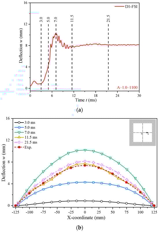 Numerical simulations of the transient response of the aluminum plate (A-1.0-1100): (a) the central deflection–time history of the plate; (b) deformed profiles for y = 0 at selected instants indicated in (a).