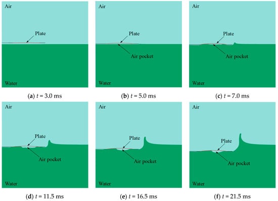 To provide comprehensive insight into the slamming phenomenon, the interaction between water and structure simulated by the established numerical model at six selected time instants is plotted in Figure 22 for the case of the aluminum plate with a drop height of 1100 mm. The results were captured across the symmetrical plane (XOZ) to clearly display the location of the fluid and the structure variation during the slamming process. When combining Figure 21a and Figure 22b, it was observed that the plate had already deformed before it contacted the water surface (t = 5.0 ms) due to the compression of the air layer. As shown in Figure 22c, when the plates impinged on the water surface, the water rose at the edge of the plate and an air pocket formed between the plate and the free surface. The air pocket was formed because the air was trapped between the water and the plate and was gradually forced into the water. Thereafter, the volume of the air pocket decreased over time but still existed during the effective process of the water impact, as shown in Figure 22c–f, which agrees with the phenomena observed in the experiment described in ref. [11]. Moreover, it is seen that the slamming pressure and central deflection of the plate reached their maximum at the instant t = 7.0 ms, whilst the plate had just reached the position slightly before the initial calm water surface, as shown in Figure 22c.