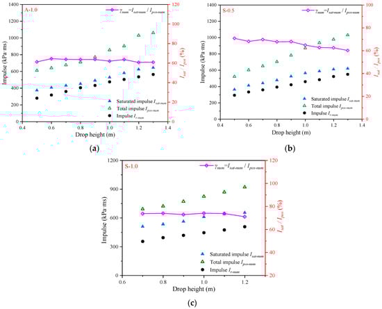 The total impulse and saturated impulse versus the drop height: (a) aluminum plates of thickness 1.0 mm, (b) steel plates of thickness 0.5 mm, and (c) steel plates of thickness 1.0 mm.