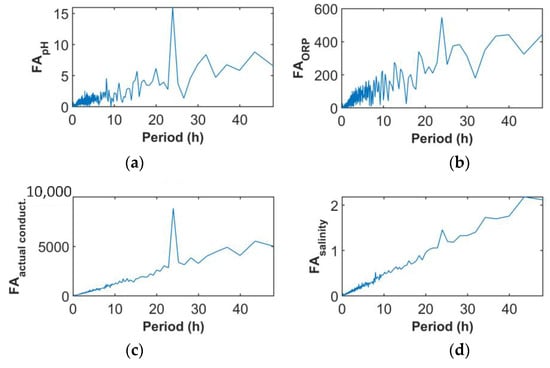 Although time series can indicate time variability, they do not provide evidence of cyclic patterns in the monitored data, such as daily, seasonal, or annual cycles. The period of occurrence of these cycles can be determined through analysis in the frequency domain, typically facilitated by the use of the Fourier transform. Fourier transform is widely used for interpreting signals with cyclic characteristics, such as those from earthquakes or dynamic motions on structures and soil [41,42], while it has also been adopted for interpreting real-time water quality data [43]. The present study computes the discrete Fourier transform of the recorded time series to produce Fourier spectra, providing insights into the significance of certain frequencies (or, equivalently, periods). The ordinates of Fourier spectra refer to the Fourier amplitude (FA), while the abscissas denote periods (P) instead of the more conventional frequency to better visualize recurrence times. Any peak in the spectra signifies a strong contribution from the corresponding period to the signal, indicating a prominent cyclic pattern with the specific period.