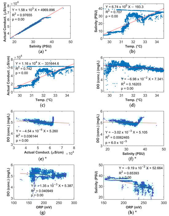 Most of the monitored seawater parameters exhibited daily variations, with dissolved oxygen and temperature showing the most significant fluctuations (Figure 7c,g). Apparently, seawater temperature is affected by the daily variations in environmental temperature, while dissolved oxygen’s daily variation can be attributed to its dependence on water temperature. The daily variations in the two parameters were found to be linearly but negatively correlated (see Figure 11a). The same correlation was also found for the overall variations in the two parameters over three months of monitoring (Figure 9d), verifying that dissolved oxygen can decrease in warm weather as a consequence of a water temperature increase [33]. Additionally, this study verifies that water temperature is linearly correlated with conductivity, salinity, and TDS (refer to Table 5).