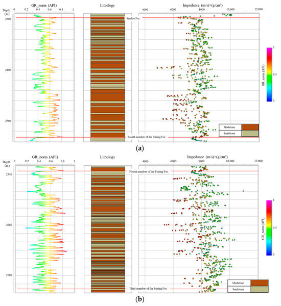 Comparison chart of lithological profile, gamma-ray, and impedance curves of the first member of the Funing Formation at well ZC1-2-1. Color-coded by gamma-ray. (a) The fourth member of the Funing Formation. (b) The third member of the Funing Formation. (c) The second member of the Funing Formation.