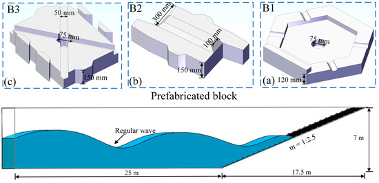 Precast blocks are usually designed with a regular rectangular shape to cover the banks of inland waterways—such as rivers, canals, and lakes—from erosional damage. [21,22,23]. Thanks to their cost-effectiveness and practicability, precast blocks are commonly used in China and other countries. However, the safety of various forms of bank protection built using precast blocks is significantly influenced by overtopping [24]. It is evident that the geometrical characteristics of precast blocks have a degree of influence on such overtopping [25]. To address this issue, we proposed three innovative slope protection structures and evaluated their ability to dissipate waves in regular conditions. These three types of precast blocks were concave and embedded regular hexagon-type prefabricated blocks, Z-type prefabricated concrete blocks, and embedded quadrangle-type prefabricated hollow blocks, referred to hereafter as B1, B2, and B3, respectively.
