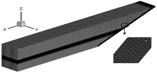 For the four types of slopes, the numerical mesh was created with blockMesh and SnappyHexMesh in OpenFOAM 2021. The mesh from the inlet boundary to the toe of the dike was orthogonal and conformal, with a cell size of 0.02 m both in the X-direction (horizontal) and in the Z-direction (vertical). Overtopping discharge is closely related to wave run-up, and [28] suggested that quadrilateral grids parallel to the slope surface may improve the accuracy with which the wave run-up on a slope can be simulated. Thus, in this study, we utilized this type of mesh near the surface, as shown in Figure 2. The mesh around the protrusions was a refinement of the base mesh achieved using SnappyHexMesh with a refined grid cell size of 0.002 m in the direction perpendicular to the slope and 0.003 m in the direction parallel to the slope. The influence of the grid size around the protrusions was analyzed for the overtopping discharge, as presented in [29].