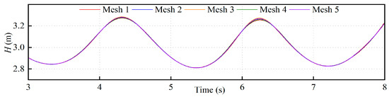 The computational mesh was set up with a horizontal length of 42.5 m, ranging from XMin = 0 to XMax = 42.5 (a height of 7 m and a width of 4.75 m). To accurately capture the wave dynamics, a gradient mesh was employed within the water surface area. The mesh was scaled in four distinct zones: from the boundary at Z = 0 to Z = 2.5, the mesh height was 0.1 m; from Z = 2.5 to Z = 3.5, the mesh height remained at 0.05 m, with 100 divisions in the horizontal direction; and from Z = 3.5 to Z = 7, the mesh height was 0.2 m. Comparisons of the free surface elevation under the wavelength L are presented in Figure 3. The results showed that different mesh densities had a minimal effect on the wave height. To better present the details of the protection provided by prefabricated rough block slopes, we used the mesh number from Mesh 3 for the following numerical simulation.