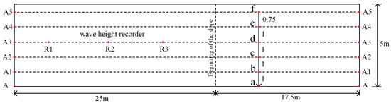 Following the simulation, six horizontal points of contact between the water surface line and the embankment were selected at various moments: a (33.5, 0, 3), b (33.5, 1, 3), c (33.5, 2, 3), d (33.5, 3, 3), e (33.5, 4, 3), and f (33.5, 4.75, 3). The defined values in parentheses refer to x, y, and z in the spatial domain. We intend to study the variation over time in terms of hydrodynamic characteristics at these points. Additionally, we analyzed the hydrodynamic characteristics at different moments by selecting transverse sections A1-A1 and A2-A2 [33] alongside vertical section points. The wave height recorders R1, R2, and R3 were set for each wave segment to determine whether the waves dissipated in real-time. The specific distribution of the sections and points can be found in the accompanying Figure 4.