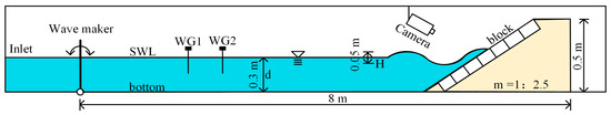 The results of an experimental wave were employed to validate the present numerical model. The experiment was conducted in the water flume located at Jiangxi Academy of Water Sciences, China, which measures 8 m in length, 0.4 m in width, and 0.5 m in height. Figure 5 shows a diagram of the experimental setup. Waves with two different wave periods and wave heights were generated in the wave flume using a flap-type wave generator. The wave generator was hinged with the bottom of the groove, and the rotation angle could be adjusted to generate waves of different heights. By adjusting the wavemaker, waves of different periods could be generated. The wave height was set to 0.05 m in the physical experiment.