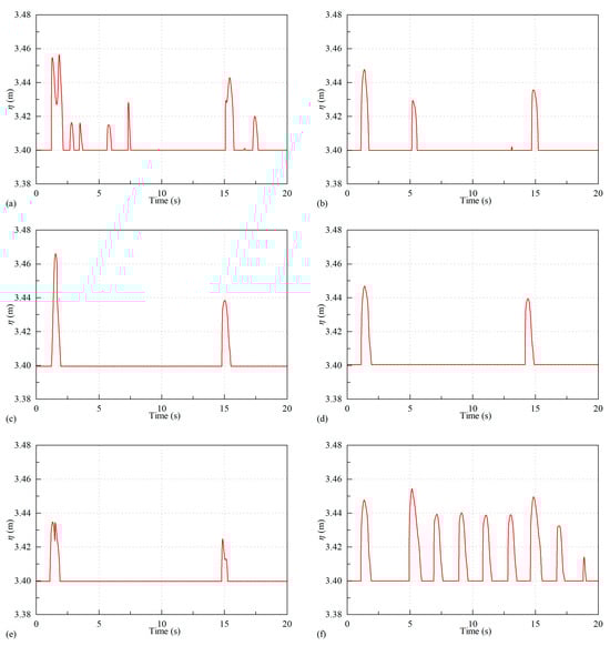 As the water ascended to the embankment, it passed through various scattered points and moved higher up the slope. When the water level at these points remained unchanged, we confirmed that the water had reached surface height at that location. In analyzing the free liquid surface elevation (η) at these six scattered points over a total computational time of 20 s, we were able to discern whether the water level had risen to that height. The wave run-up on the embankment clearly exhibited a certain periodicity, with the water level remaining unchanged at the embankment surface even across several time intervals. This periodic behavior provided insights into the dynamics of the waves’ interactions with the embankment surface, offering valuable information on the influence that wave characteristics—such as frequency and amplitude—have on the wave run-up dynamics.