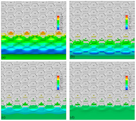 Three-dimensional map depicting the local water surface profile of the embedded hexagonal model. (a) t = 1.4 s; (b) t = 6.6 s; (c) t = 12.8 s; (d) t = 17.2 s.