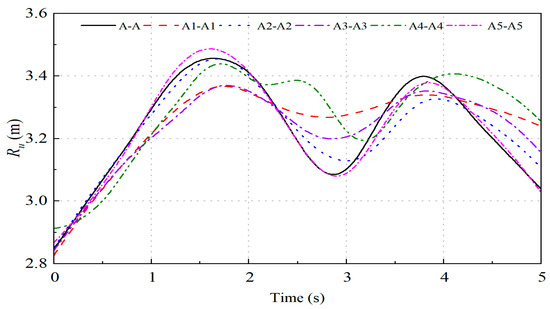 In comparing the free surface elevation at scattered points, we could identify the sections in which the maximum wave run-up occurred, and the free surface and water depth distribution data could be gleaned in sections A-A, A1-A1, A2-A2, A3-A3, A4-A4, and A5-A5 during these time intervals. The water depth decreased as the wave run-up height increased, reaching zero at the point at which the wave reached its maximum height on the embankment surface. The water depth remained zero above this point, indicating an absence of liquid on the embankment surface. The water depth here refers to the depth starting from the slope. The maximum wave run-up height was defined as the vertical distance from the still water level to the highest point reached by the wave on the embankment surface, measured when the wave stopped advancing and began to recede. We statistically analyzed the maximum wave run-up conditions at these cross-sections by processing the maximum wave run-up values at each time.
