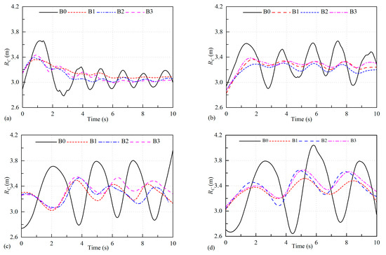 In the model tests, we observed that the maximum wave run-up on each prefabricated block slope occurred within the first few cycles. Consequently, we measured the wave run-up values for the first 20 s of testing each precast block; we also identified the maximum wave run-up for a comparison of wave dissipation. The maximum recorded water run-up heights for the four different conditions are presented in Table 3 and Figure 9. B0 refers to a smooth slope form of protection, which was used as the control group to demonstrate the wave-dissipating effects of the other block slopes.