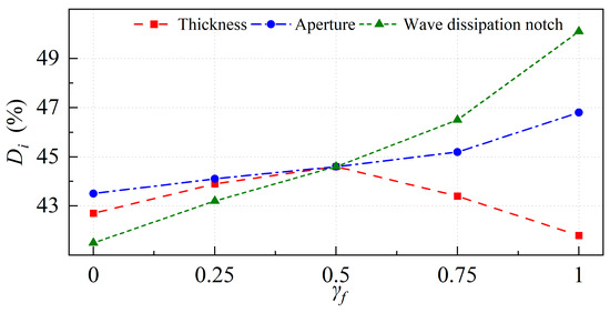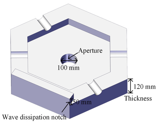 After determining the optimal wave dissipation performance of the B1 prefabricated block slope, we carried out further investigation into B1’s effect on the wave run-up height when its geometrical characteristics changed. The roughness of B1 encompassed its thickness, aperture, and wave dissipation notch, as shown in Figure 10. A prefabricated B1 block with a thickness of 120 mm, aperture of 100 mm, and wave dissipation notch width of 50 mm was selected [35]. In the numerical simulation process, the wave run-up reduction efficiency Di was used to reflect the rate at which the wave run-up height was reduced when different geometrical characteristics were present. Although the EurOtop Manual provides comprehensive guidelines for analyzing roughness in coastal and hydraulic engineering contexts, it does not specifically address methods for observing concrete blocks with unique geometrical features such as those depicted in our study.