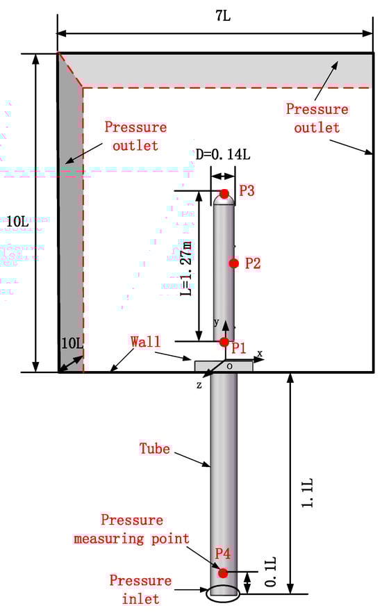 The computational domain of the model contains not only the flow field region inside the launch tube but also the outer flow field region, consisting of the upper surface and the upper part of the launch platform. The computational domain is a cubic computational domain, and the computational domain and boundary conditions are shown in Figure 3. The height of the computational domain in the vertical direction is 10 L. In addition, the length of the computational domain is chosen to be 7 L, and the width of the computational domain is chosen to be 10 L. The top and side boundaries of the computational domain are the boundary conditions for the pressure outlet. The bottom of the cylinder is the pressure inlet boundary with a pressure value of 0.63 MPa. The pressure inlet boundary at the bottom of the launch cylinder changes to a no-slip wall boundary when the tail of the projectile leaves the launch cylinder.