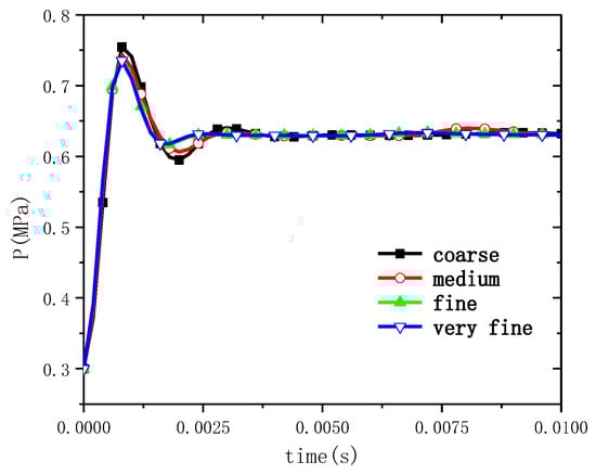 The mesh-independence of the computational model mesh was verified prior to the development of the analyzes. For better convergence conditions and computational time, the time step is taken as 2 × 10−6 s. The transient calculation method was used to investigate the pressure characteristics of the gas flow through the gap between the missile and the launch tube. Calculations were carried out using the above model for four different numbers of grid models, with pressure monitoring points at the cylinder gap at the bottom of the launch tube. The location of the measurement point is point P4 in Figure 3. Figure 5 shows the time history curves of the pressure at the corresponding measurement points for different grid models under the same condition.