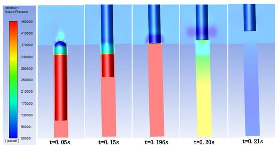 Combined with the test, the above flow numerical model is used to establish a ground-based concentric cylinder launch simulation model and carry out application analysis, and the model data are the same as the test parameters. The simulation model includes the concentric tube launcher, the test missile, and the engine. The computational domain covers the flow area inside the launcher and the ambient atmosphere. The pressure no-slip adiabatic wall is used in the structural wall, the pressure inlet boundary is used in the engine outlet, and the pressure outlet boundary is used in the atmospheric outfield region. The computational grid at typical moments of the computational process is shown in Figure 6b.