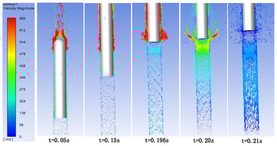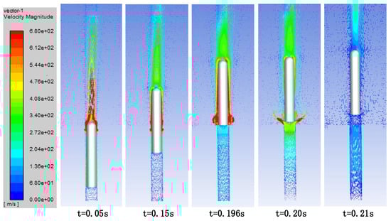 Figure 8 and Figure 9 show the pressure cloud and velocity vector diagrams of the flow field during the missile launch separation process, respectively. At t = 0.05 s, a low-pressure region appears in the missile head, which is mainly due to the effect of the flow-blocking ring. The gas in the lower part of the ring is a highly under-expanded jet, and the gas expands and accelerates after passing through the ring. After that, the expansion of the gas through the mouth of the cylinder is intensified, the speed is faster, and a low-pressure zone is formed in the head of the missile. At t = 0.15 s, the distance of the missile out of the tube increases. The gas forms an advective jet on the surface of the missile, and the pressure on the surface of the missile is low. At t = 0.196 s, the missile leaves the tube, and a ring-shaped low-pressure region appears at the missile tail. This is due to the fact that the gas is no longer constrained by the cylinder wall and the side of the missile, and the high-speed gas jet expands radially. Thereafter, the pressure inlet at the bottom of the launch tube is closed, and the ejected gas no longer increases. At t = 0.2 s, the missile exits the tube for a distance, and the gas pressure inside the tube decreases rapidly, while the fluid velocity on the missile surface also decreases rapidly. In addition, due to the friction between the gas and the wall of the missile and the fluid viscosity, a vortex region is formed at the tail of the missile. At the moment of t = 0.21 s, the pressure inside the cylinder is basically equal to the ambient pressure, and the vortex region attaches to the missile tail and moves with the missile.