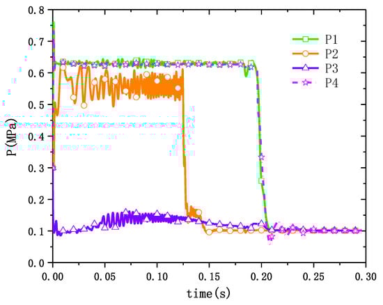 The pressure time history curves of the monitoring points are given in Figure 10. P1 is the pressure measurement point at the center of the bottom of the missile. P2 and P3 are the measurement points at the middle surface of the missile and at the center of the missile head, respectively. P1 to P3 are the moving measurement points, which follow the missile movement. P4 is the measurement point at the bottom of the tube, which is fixed with respect to the launching tube. The location of the measurement points is shown in Figure 3.
