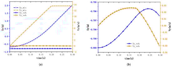 Figure 13 gives the parameters of the rotation of the missile and the launch platform about the X-axis. Figure 13a gives the constraining moment to which the missile is subjected and the angular velocity profile of the rotation, where the angular velocity profile of the launch platform is given by the active motion. The constraining moment to which the missile is subjected is obtained according to Equation (13), and the action time corresponds to the constraining force to which it is subjected. As shown in the figure, the rotational angular velocity of the missile is relatively stable when no constraining moment is generated. When t < 0.125 s, the missile is subjected to a smaller restraining moment and its angular velocity changes less. Thereafter, the missile is subjected to a larger rotational moment, and the angular velocity of the missile decreases rapidly to 0.01 rad/s. When the lower slider leaves the cylinder, it no longer restrains the restraining moment, and the angular velocity of the missile remains stable. Similarly, the restraining moment directly changes the missile rotational angular velocity and thus the missile corner. Figure 13b gives the curve of the rotation angle of the missile around the X-axis. From the figure, it can be seen that the trend of the rotation angle change of the missile and the launch platform remains the same at t = 0~0.18 s. After that, the effect of the guideway slider constraint disappears and the two move independently. The above results show that the guideway slider constraint model can well characterize the constraint effect of the platform on the missile during the launching process.