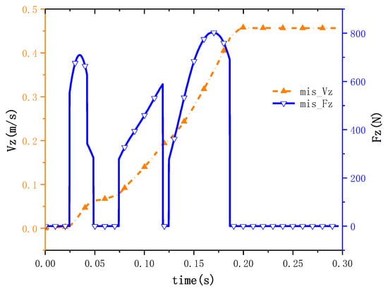 Since the effect of transverse rocking on the missile is more pronounced, the motion characteristics caused by transverse rocking are mainly analyzed next. Figure 12 gives the constraint force and velocity profile of the missile in the direction. The force curve in the figure is the constraint force on the missile under the inertial system, which is mainly generated by the contact collision between the slider and the guideway. The velocity profile reflects the kinetic response of the projectile when subjected to external constraining forces. As shown in the figure, t = 0.025~0.05 s, the displacement of the slider in the direction of the cylinder system is larger than the gap of the guide rail slider, which generates the contact force. The velocity of the missile increases gradually after it is subjected to the constraining force. At t = 0.05~0.075 s, the missile is released from contact under the action of the constraining force, the two do not produce constraining force, and the velocity of the missile is relatively stable. Thereafter, with the growth of the distance of the missile out of the cylinder and the active motion of the launch platform around the X-axis, there exists a longer contact between the two until the lower sliding block leaves the cylinder. During this period, the missile’s velocity gradually increases under the action of the constraining force. The constraining force directly changes the missile’s velocity and thus its displacement, ensuring that the missile’s relative position is stable under the cylinder system.