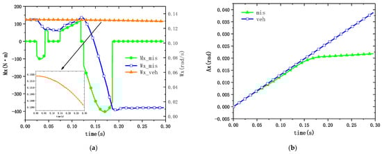 Parameter curve of object rotation around X-axis: (a) constraining moment and rotational angular velocity of the missile; (b) angle of rotation of the object about the X-axis.