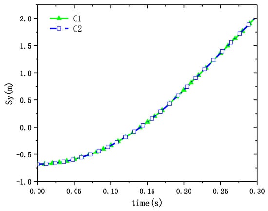 The displacement curves of the missile along the direction in the two working conditions are given in Figure 15. From Figure 15, it can be seen that the two curves almost completely overlap, indicating that a wind load of 10 m/s has no effect on the axial motion of the projectile.