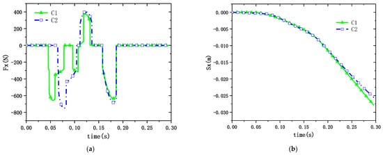 Force and displacement of the missile along the X-direction: (a) missile force curve in the X-direction; (b) missile displacement curve in the X-direction.
