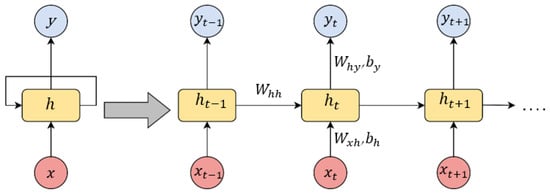 RNNs are neural networks designed to capture sequential information in data [,]. They maintain and propagate information through time by allowing connections between hidden units across different time steps. Figure 2 illustrates the structure of RNNs that learn and exploit these temporal dependencies [,]. The hidden state at time t, denoted as , is computed based on the current input, , and the previous hidden state, . This computation can be expressed as follows: