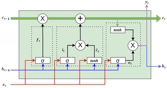 LSTM is an advanced recurrent neural network architecture designed to address the long-term dependency problem of traditional RNNs []. The key innovation of LSTM is the introduction of a memory cell and three gates: input gate, forget gate, and output gate. These gates control the flow of information through the cell state, allowing the network to selectively remember or forget information over long sequences. The structure of an LSTM cell is shown in Figure 3.