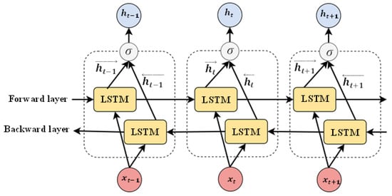 Bi-LSTM extends the traditional LSTM model to process sequences bidirectionally, thus incorporating both past and future information []. Bi-LSTM utilizes two independent LSTM layers; one processes the sequence from left to right (forward LSTM), and the other from right to left (backward LSTM). At each time step, the hidden states from the forward LSTM () and the backward LSTM () are concatenated to form the final hidden state (). Figure 4 illustrates the structure of the Bi-LSTM.