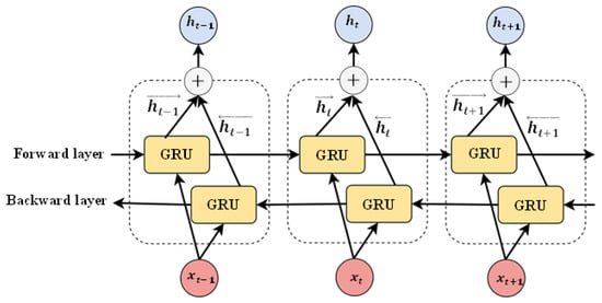 Bi-GRU is an extension of GRU that incorporates bidirectional processing, similar to Bi-LSTM []. By processing the sequence in both forward and backward directions, Bi-GRU can capture both past and future context, which can be beneficial for tasks such as ship trajectory prediction. The structure of a Bi-GRU is shown in Figure 6.
