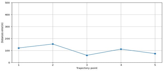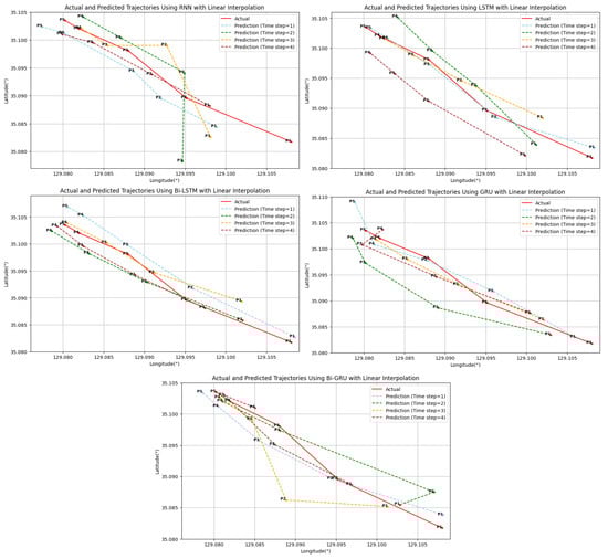 Table 6 provides a summary of the distance errors at each trajectory point and the average errors for the overall trajectory and the pier vicinity area. The overall average distance error across all points is 103.9 m, while the average error in the pier vicinity area (points 3–5) is 81.6 m. This indicates that the LSTM model performed approximately 21.4% more accurate predictions in the hazardous pier vicinity area compared to the entire area. Although there are few existing studies specifically focusing on inbound vessel trajectory prediction, making a direct comparison difficult, our study introduces a novel feature tailored to predict vessel movements within the port, offering a differentiated approach from prior research. Compared to previous studies, Park et al. (2021) predicted vessel trajectories near Busan Port using Bi-LSTM, LSTM, and GRU models. Their results showed that Bi-LSTM was the most accurate model in terms of RMSE. Specifically, for Group A, the distance RMSEs of Bi-LSTM, LSTM, and GRU were 101 m, 217 m, and 194 m, respectively, and for Group B, the RMSEs were 107 m, 191 m, and 169 m, respectively. In comparison, the LSTM model in our study achieved a mean error of 81.6 m in the pier vicinity area, demonstrating superior performance in a complex port environment like Busan. Ref. [] employed a combination of the ACoAtt attention mechanism and LSTM to manage complex relationships between vessel attributes such as speed and direction, achieving a mean absolute error (MAE) of 121.9 m and an RMSE of 130.6 m. In contrast, our LSTM model recorded an overall average error of 103.9 m and an average error of 81.6 m in the pier vicinity area, indicating improved performance in a more constrained port environment. Although the two studies were conducted in different environments, making direct comparison difficult, our research emphasizes its practical contributions to port operations by offering predictions specifically tailored to complex traffic conditions within the port.