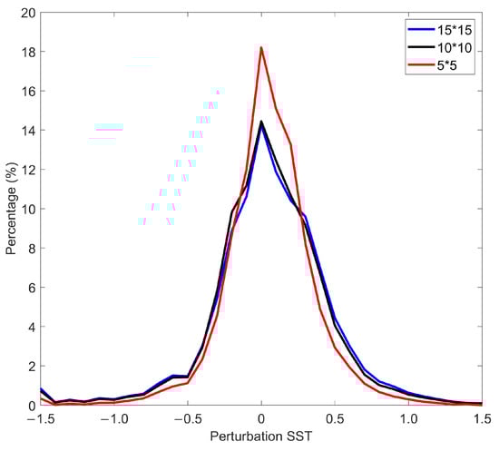 According to the weight function,  is the observed value of this point. When  reaches the minimum value, the solved  is the smooth value at the target point. We selected different half-span parameters for filtering and obtained the probability distribution of the mesoscale signals from 2003 to 2008. When the half-span parameter is 10°, the filtered SST perturbation probability distribution is similar to that obtained when the half-span parameter is greater than 10° (Figure 1).
