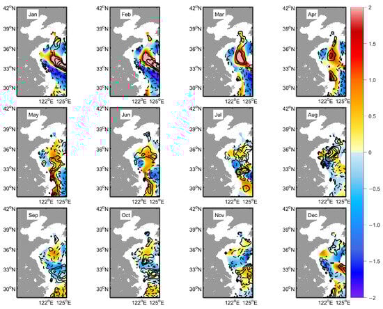 Spatially high-pass filtered WSmeso (contours) and SSTmeso (colors) in the different months in 2006. The contour interval is 0.003 N·m−2. The zero contours are not included.