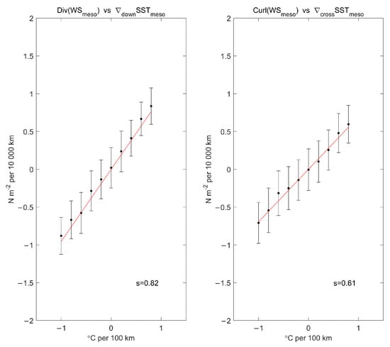 Scatterplots of the spatially high-pass filtered Quik-SCAT Div(WSmeso) and Curl(WSmeso) binned by ranges of AMSR-E ∇down SSTmeso and ∇cross SSTmeso perturbations. The coupling coefficient is denoted as S. Points and error bars represent the mean and standard deviation in each bin, respectively.