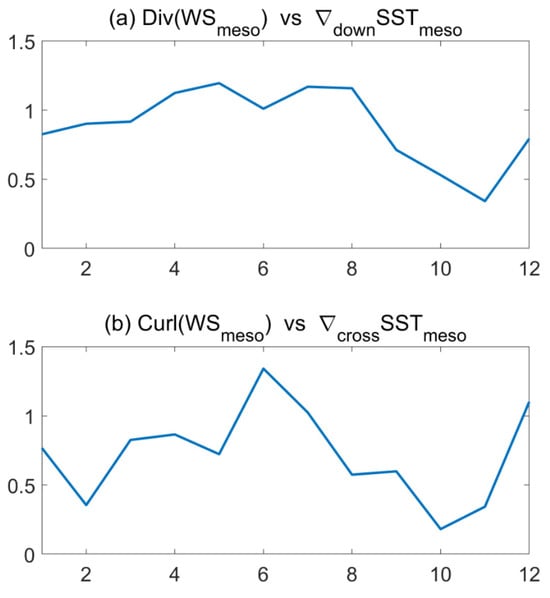 The monthly variations in the coupling coefficient (N·m−2/(°C·100 km)) between (a) Div(WSmeso) and ∇down SSTmeso and (b) Curl(WSmeso) and ∇cross SSTmeso.