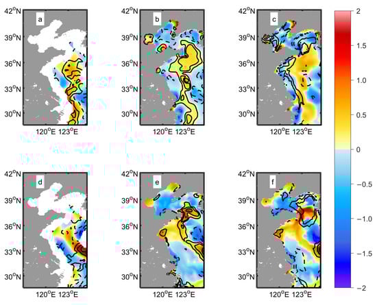 These findings were consistent with previous research. For instance, studies on marine heat waves in the YS and ECS have shown that the occurrence of marine heat waves is largely influenced by decreased wind speeds and the advection of warm water [,]. Marine heat waves have an important influence on marine ecosystems []. Moreover, the SST in winter is associated with the YS cold water mass, which provides a suitable environment for primary production and benthic organisms [,]. Therefore, investigating the influence of mesoscale air–sea interactions on SST is essential for understanding the changes in both dynamic and ecological environments in the YS and ECS.