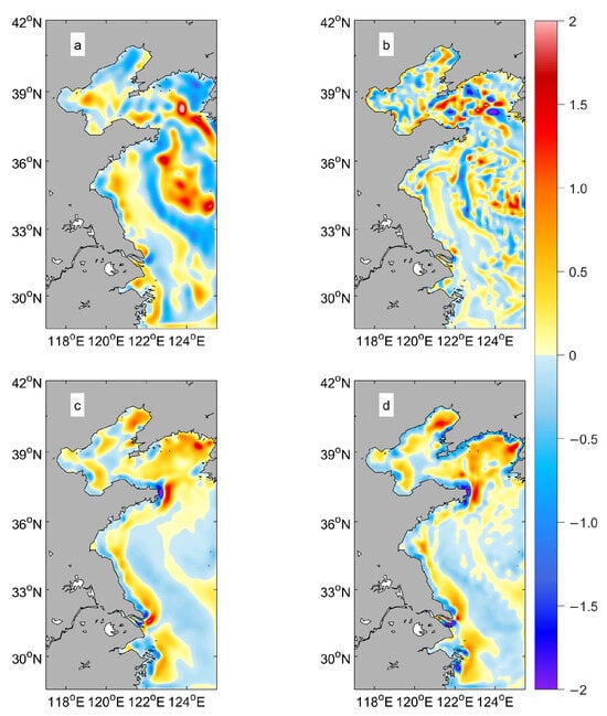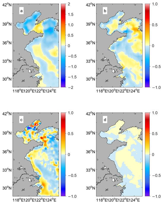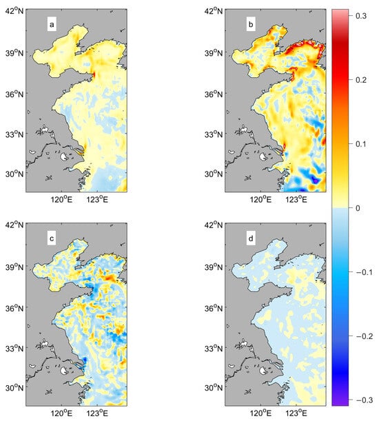 Figure 7a shows the average temperature difference in the upper 50 m of the ocean (MESO-E minus CONTROL-E). The temperature in the nearshore region of the ECS experienced an increase in the MESO-E, with maximum SST values reaching 0.62 °C. In contrast, the temperature in the upper 50 m in most areas of the YS exhibited a decreasing trend throughout the year.