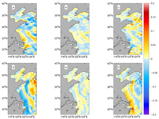 Figure 10 shows the differences in the winter horizontal current between the SODA and CONTROL-E, between MESO-E and CONTROL-E, and between MESO-E and SODA. It shows that the simulated zonal current in CONTROL-E was smaller than that in SODA in the coastal area of the YS and ECS and the middle region of the YS (Figure 10a). The simulated meridional current in CONTROL-E was larger than that in SODA in the nearshore area and the middle area of the YS and smaller than that in SODA in other regions (Figure 10d). After adding the mesoscale coupling method to the model, the simulated zonal current strengthened in the coastal area of the YS and ECS and the middle region of the YS (Figure 10b). The simulated meridional currents weakened in the nearshore area and the middle area of the YS and strengthened in other regions (Figure 10e). In conclusion, the change in ocean horizontal velocity caused by mesoscale coupling can reduce the difference between the model and SODA data well (Figure 10c,f). The strong spatial correlation of the sets of the difference results indicated that the addition of mesoscale ocean–air coupling in winter could significantly improve the simulation accuracy of the horizontal current. Observations showed that in addition to stable positive SSTmeso in the coastal waters of the ECS, the distribution of mesoscale signals in other regions varied significantly in the summer of each year. Therefore, the improvement in the model’s dynamic system was not as pronounced in summer as in winter.