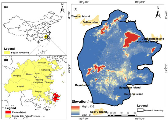 The location of the study area. (a) The location of the study area in Fujian Province, China. (b) The location of the study area in Fuzhou, Fujian Province. (c) The boundary and elevation of the study area.