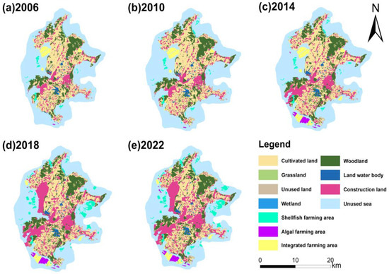 The land use data for Pingtan Island for the years 2006, 2010, 2014, 2018, and 2022 were obtained from the Data Center for Resources and Environmental Sciences, Chinese Academy of Sciences (http://www.resdc.cn/, accessed on 1 March 2024), with a resolution of 30 m. Remote sensing images during these five years and mariculture map layers were obtained from the Island Research Center of the Ministry of Natural Resources; the multiyear aquatic fishery data were obtained from the Pingtan Yearbook 2015–2022 [26]. In accordance with the research requirements and practical circumstances of Pingtan Island, remote sensing images were combined with relevant mariculture survey data via ArcGIS 10.8 software to obtain island utilization data. This not only improved the accuracy and timeliness of island utilization data but also provided strong data support for island resource management and sustainable development planning. Specifically, for the land area of the island, the utilization data of the land area of the island were combined with remote sensing images for visual interpretation and reclassification; ultimately, the land area of Pingtan Island was classified into seven categories: cultivated land, woodland, grassland, unused land, construction land, land water bodies, and wetland. For the sea area of the island, existing mariculture survey data were combined with visual interpretations of the five remote sensing images, and field investigations were conducted on uncertain aquaculture types; ultimately, the sea areas utilized on Pingtan Island were classified as shellfish farming areas, algal farming areas, integrated farming areas, and unused sea areas.