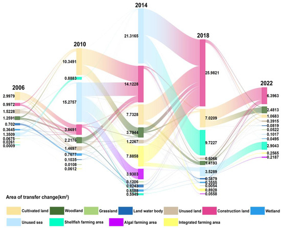 The transfer process of different island utilization types on Pingtan Island, 2006–2022. The length and numerical label of each input or output column represent the total transferred area of a specific island utilization type, whereas the width of the connecting flows between columns signifies the amount of area that is transferred from one island utilization type to another.