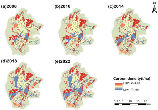 The spatial distribution of carbon density on Pingtan Island, 2006–2022. (Note: To better understand the characteristics of the spatial distribution of carbon density on Pingtan Island, we distributed the ocean carbon sinks proportionally and evenly to the area of each island sea use type and comprehensively calculated the value of carbon density for each island use type.)